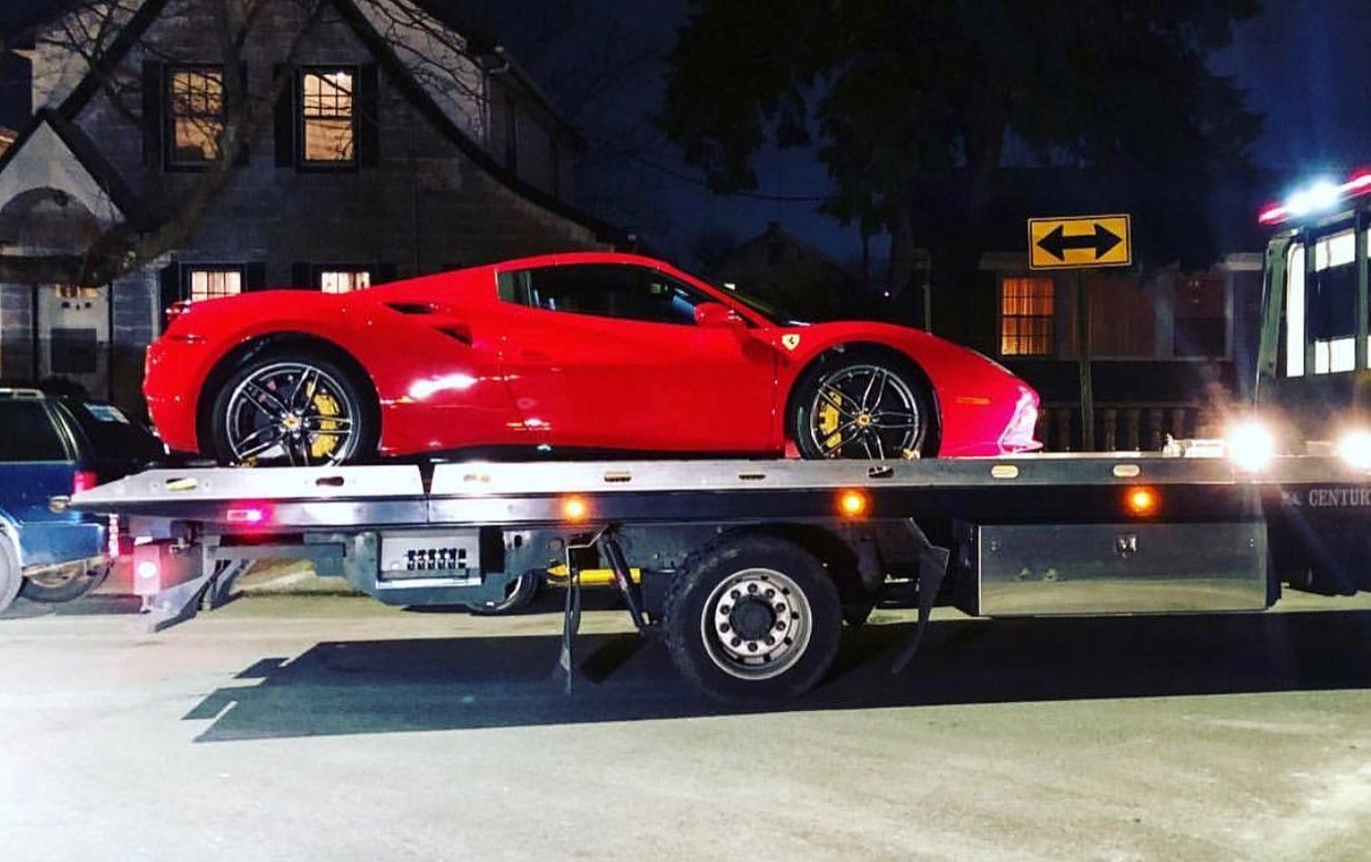 50 Cent’s Ferrari loaded onto a break-down truck after the battery failed – Credit: 50 Cent (social media)