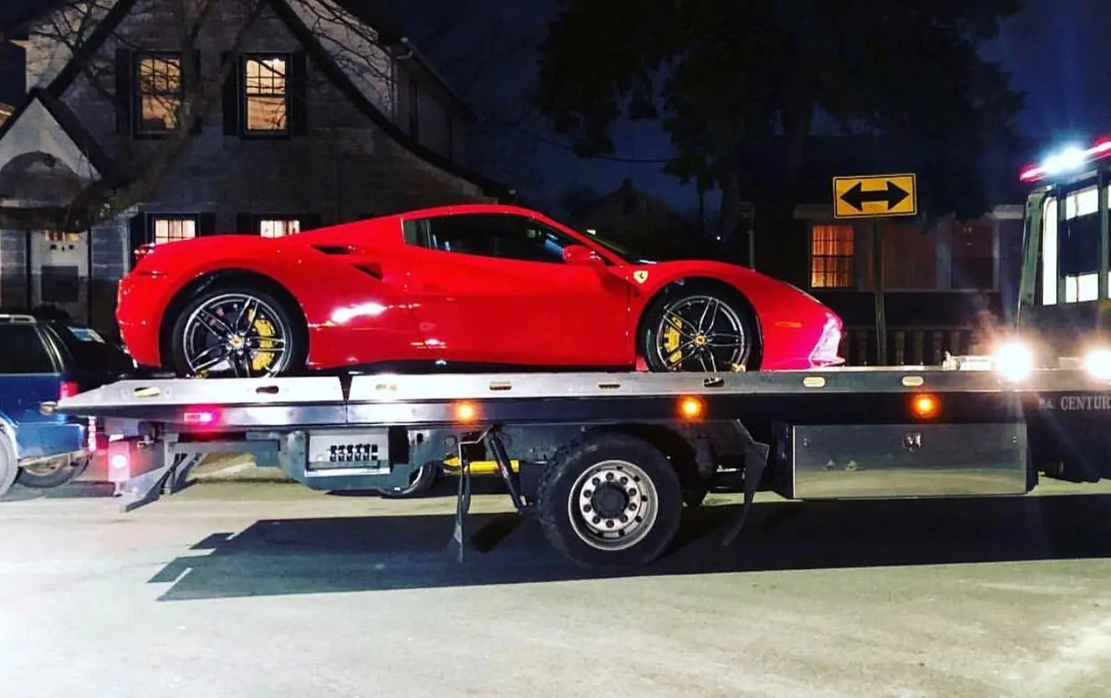 50 Cent’s Ferrari loaded onto a break-down truck after the battery failed – Credit: 50 Cent (social media)