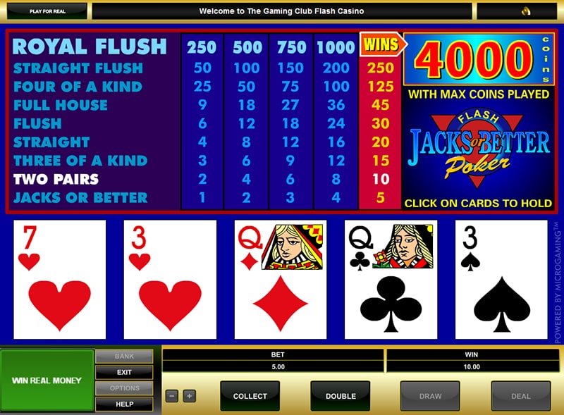 There are myriads of Jacks or Better video poker variants out there. You will want to make sure that you play at a table that offers you the best returns for your winnings. We always advise heading for a table with a 9/6 ratio. It’s easy to work this out, as it is the ratio of odds the machine pays on a full house. In this case, the odds are 9:1.