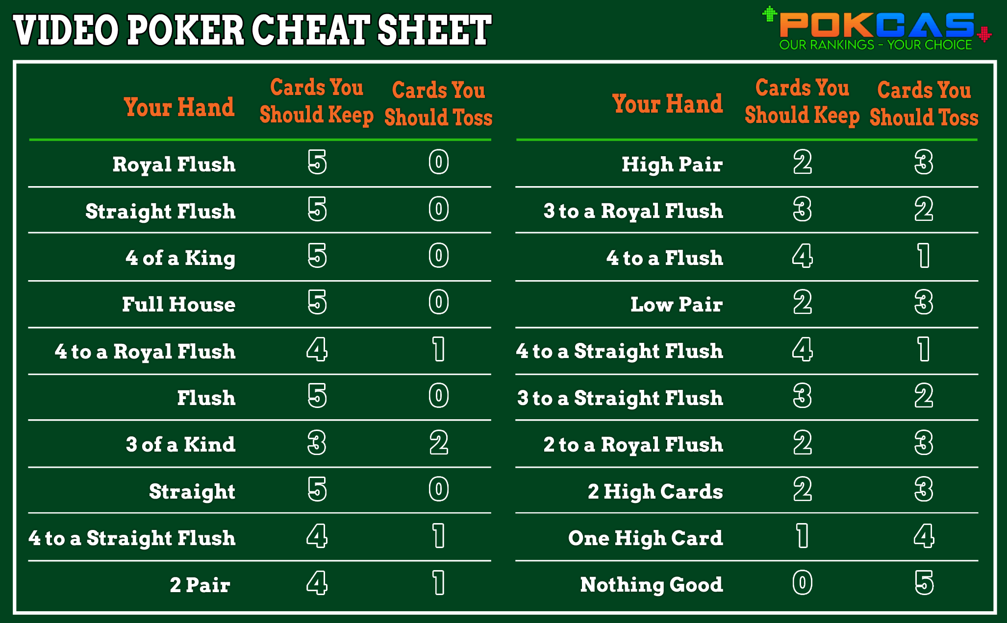 - Card Discards: You may discard between 0 and all 5 cards if you so choose. Our cheat sheet will help you make up your decision here.