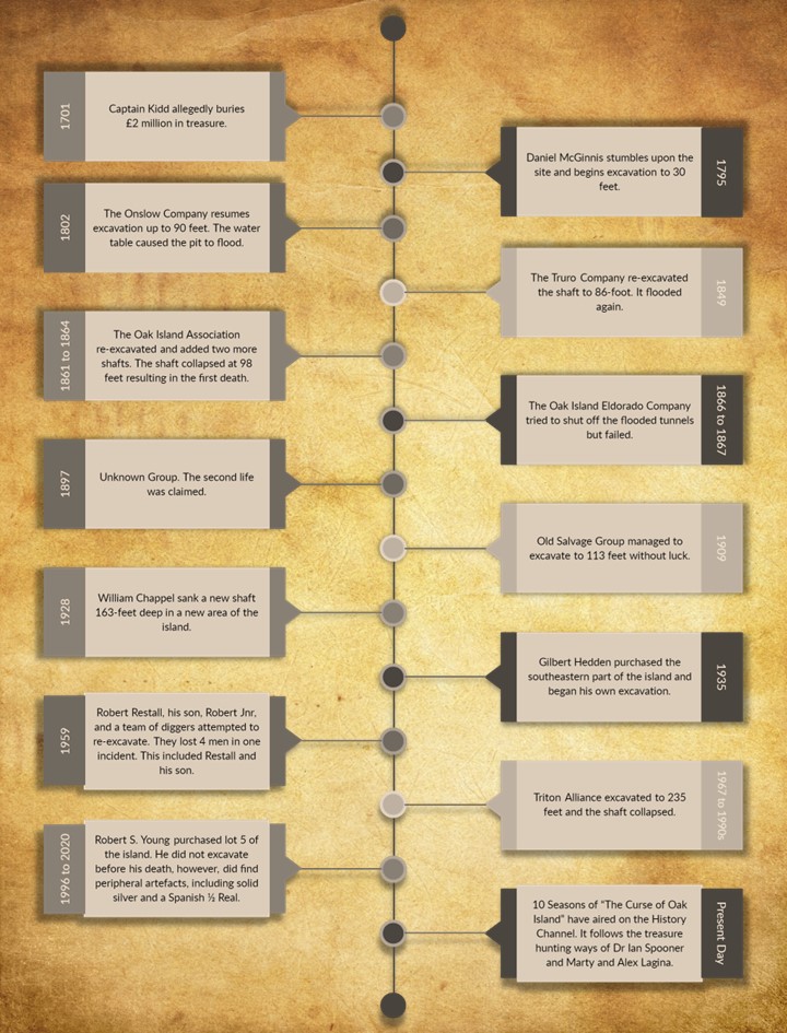 As mentioned before, the excavation site at Oak Island has changed hands many times. During this time the Oak Island Treasure has yet to be found. Below is a timeline indicating just how many companies and private hunters have officially searched for the alleged loot.