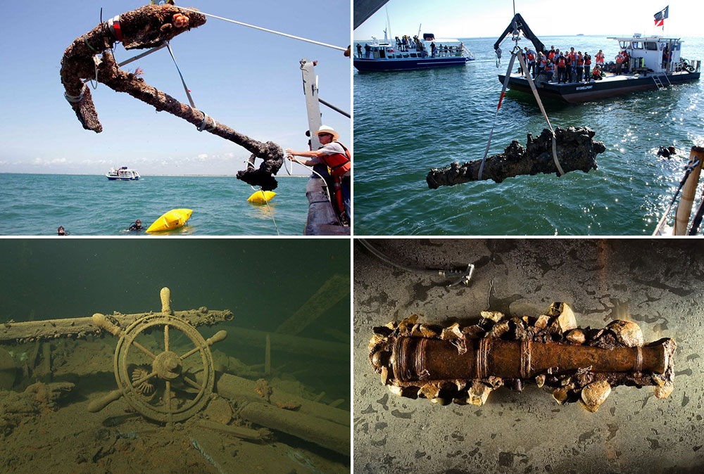 An anchor, cannons, and other artefacts found at the site of the shipwrecked “Queen’s Revenge” – Collage by PokCas