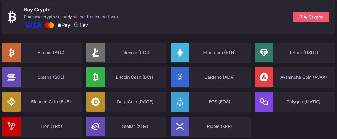 When making deposits, there is a host of options available to you. These include mainstream currency methods like credit cards and virtual cards/vouchers. However, that’s where it ends. There are, however, 15 different cryptocurrencies for you to deposit and withdraw with. These are all displayed in the image below.