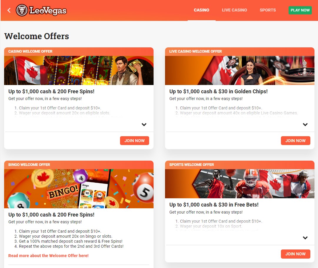 Of course, the welcome bonuses are generally the most sought-after. It was a tough task to single out one regional bonus from another, but we must say that LeoVegas Canada’s promotions certainly caught our eye the most. They offer bonos for the casino, sportsbook, bingo platforms, and live casino.