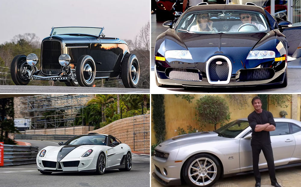 Stallone’s Cars – Highboy HotRod (top left), Bugatti Veyron (top right), Ferrari 599 GTB (bottom left), Chev Camaro (bottom right)