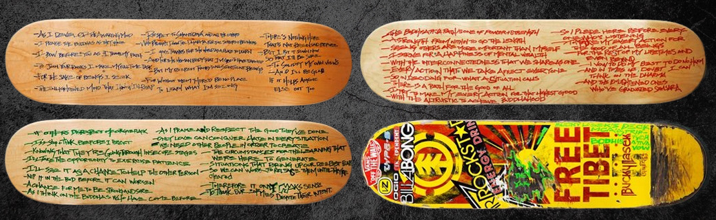 The bottom right board in the image above actually belonged to Bucky, while the other three were new decks with the lyrics of the song Bodhisattva Voe emblazoned on them. The four sold together as a set for $35,000. The proceeds went to building a skate park in New York, in memory of Adam Yauch who passed away two months after the auction was held in 2012.